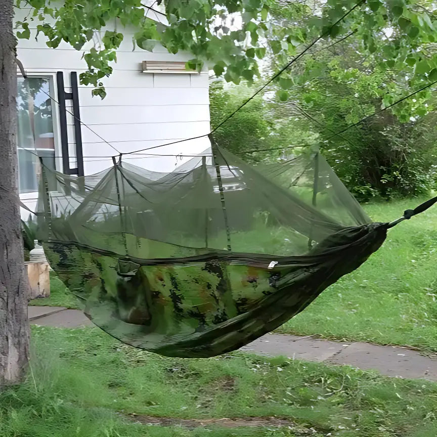 This Big Hammock Tentoffers exceptional strength for minimal weight for ultralight trekkers. Its 300 kg load capacity accommodates two people comfortably. The straightforward setup with straps and carabiners makes impromptu bivouacs and frequent camp changes simple. This military-style hammock with integrated mosquito net and complete fixing system allows you to enjoy full immersion in nature.