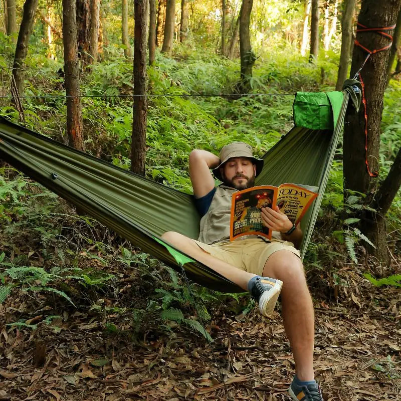 This Hammock Tent Combo redefines bivouac kit for outdoor enthusiasts. The high-density 70D nylon offers an optimal strength-to-weight ratio with a wide sleeping surface. The anti-roll system prevents the hammock from turning over, allowing you to move without risk of falling during the night. The 10 suspension points and ground pegs enable discreet installation on all types of terrain.The integrated mosquito net provides effective protection against insects, essential when crossing endemic areas.